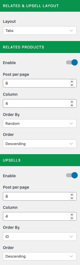 These options allow you to personalize the Related Products & UpSells sections. You can change it to a Tab or List format, change the number of products displayed, etc.