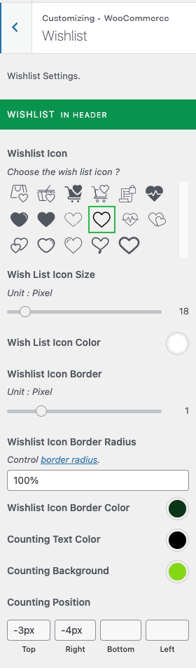 This option allows you to customize the Wishlist icon and style in the Header and the Product box when hovering over it.