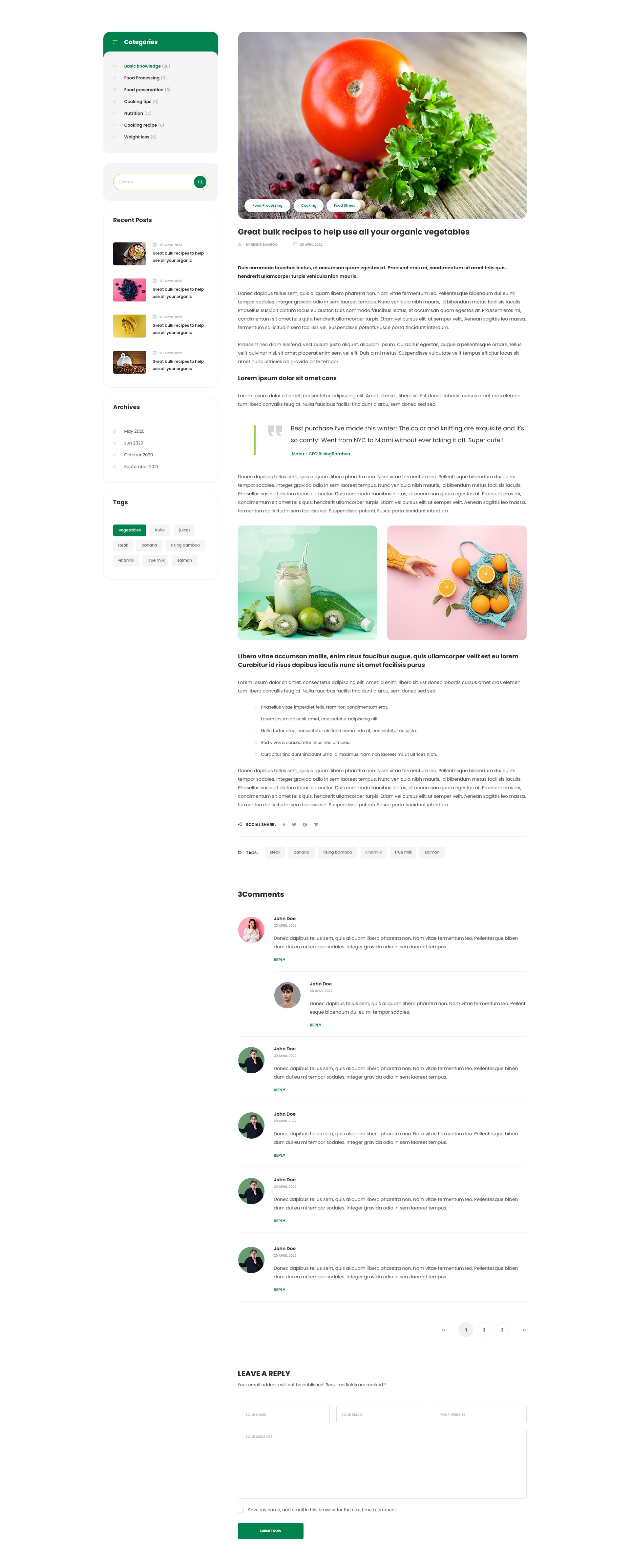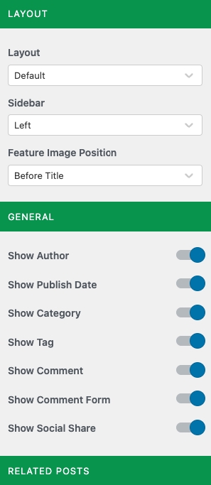 These are 2 setting sections to customize the blog image position and sidebar position, and customize the turn Off/On elements in the Blog Content section.
