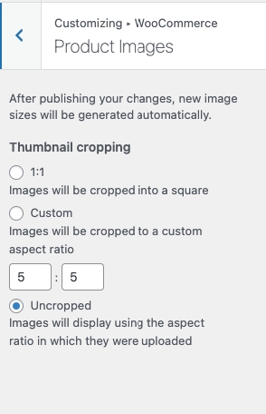 This option lets you adjust the size ratio of Product image thumbnails. Once you save your changes, new image sizes will be automatically generated.