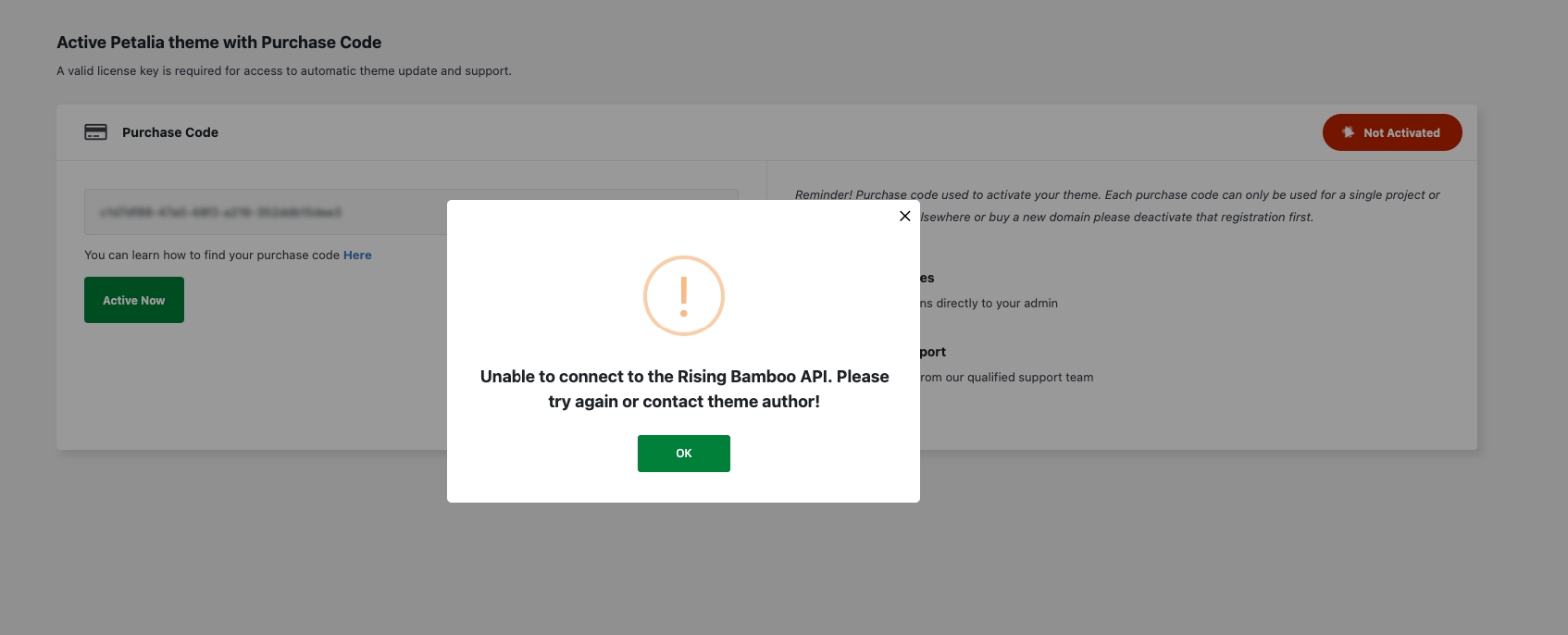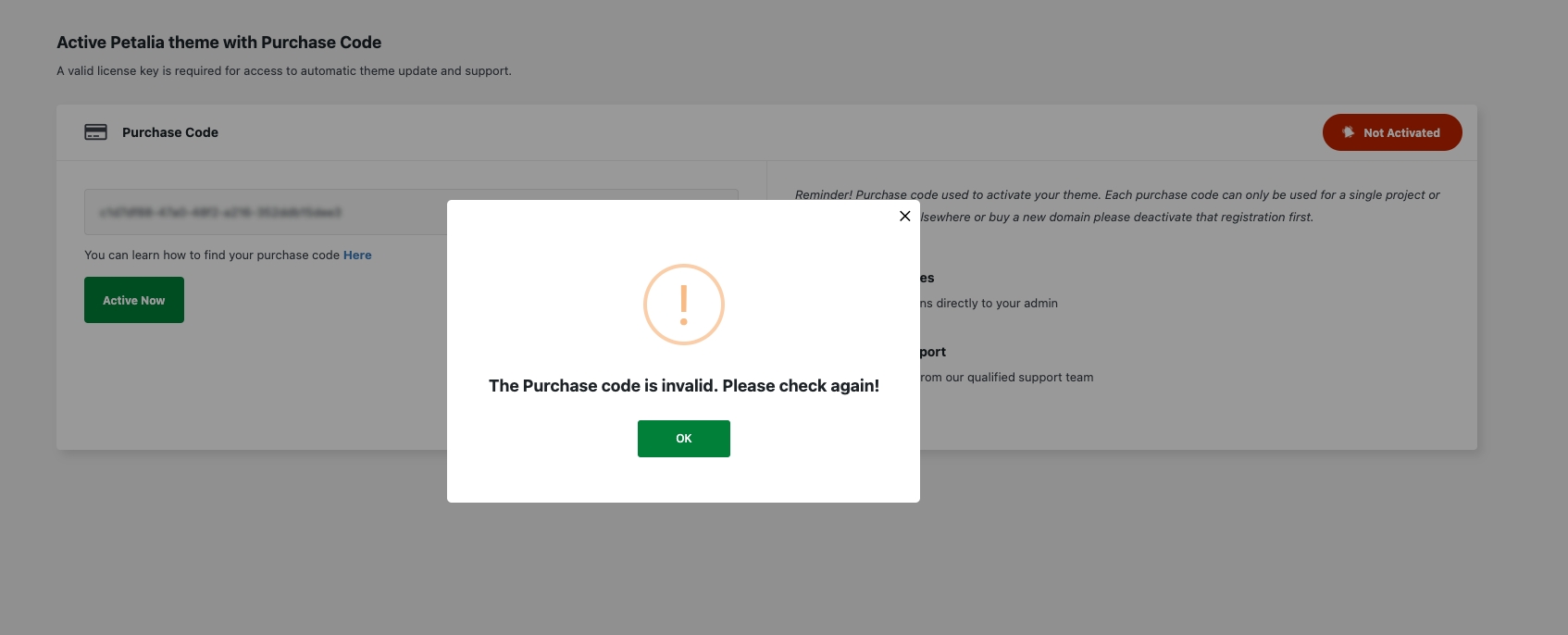 We recommend double-checking your purchase code and ensuring it’s copied exactly as provided—including all hyphens and without any extra spaces.