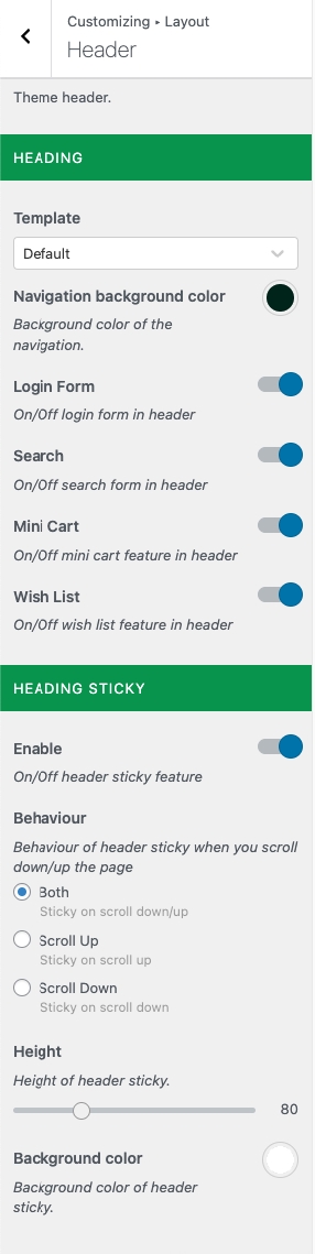 Sticky Menu: Customize the Header sticky in the HEADING STICKY section
